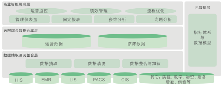 3)需要有高质量的数据分析系统,给予对多个应用系统数据进行关联和整合的便利手段,给予对海量数据的洞察力,挖掘数据潜在价值的,帮助医院优化运营。