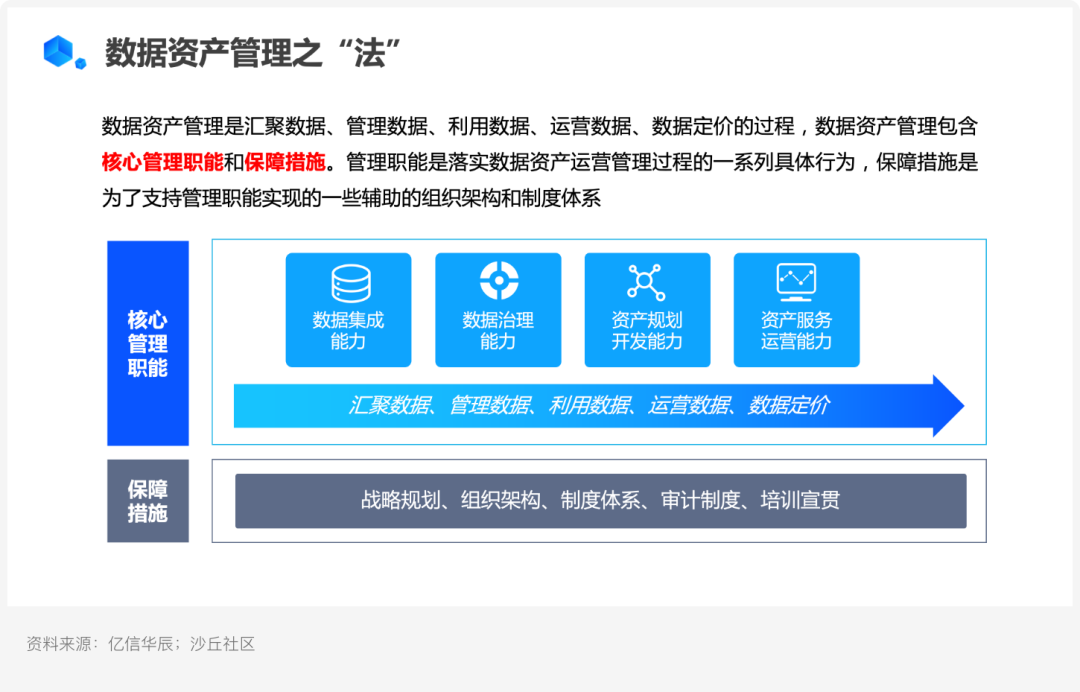 数据资产管理包含核心管理职能和保障措施。核心管理职能是落实数据资产运营管理过程的一系列具体行为,包括数据集成、数据治理、资产管理等;保障措施是为了支持管理职能实现的一些辅助的组织架构和制度体系。