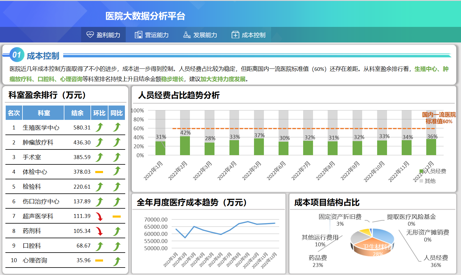 方案给予管理驾驶舱、专科运营分析、预警防控等模块。管理驾驶舱可进行全院效益分析和全院工作量的实时统计,展现全院门诊、急诊、住院患者的疾病分布和医院患者流向分布,用数据辅助院长实行人财物等各方面的管理和决策提升。专科运营分析主要围绕人力资源、财务、资产、设备、科研、教学等多个专题进行,包括门急诊运营、住院运营、手术情况、检查情况、检验情况、药学指标分析、医保指标分析等。预警防控则是根据运营分析相关数据,分析事件开展趋势,与管控目标值比较,及时提出预警,以便及时进行风险研判、评估和制定防控措施。