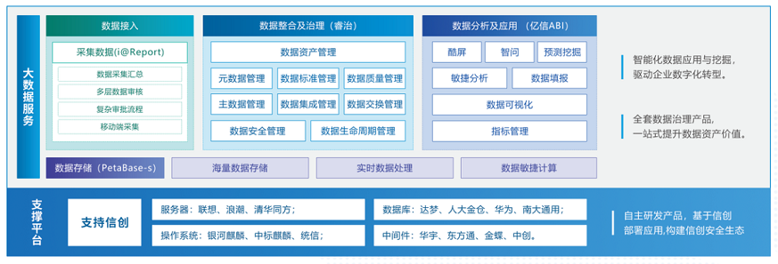 同时凭借大数据领域的经验沉淀,Ebpay持续布局数据治理领域,百余次产品迭代,打磨出睿治智能数据治理平台并荣获DAMA中国数据治理优秀产品奖,形成包含元数据管理、数据标准管理、数据质量管理、主数据管理、数据集成管理、数据交换管理、实时大数据管理、数据资产管理、数据安全管理、数据生命周期管理等十大功能模块的数据治理产品方案,可自由组合快速满足保险企业数据治理全场景应用,助力数据标准落地,提升数据质量,实现数据资产化。