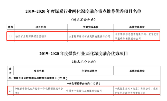 数据治理项目荣获2019-2020年度煤炭行业两化深度融合重点推荐优秀项目;中煤晋中能化生产经营一体化数据集成平台项目荣获2019-2020年度煤炭行业两化深度融合优秀项目。