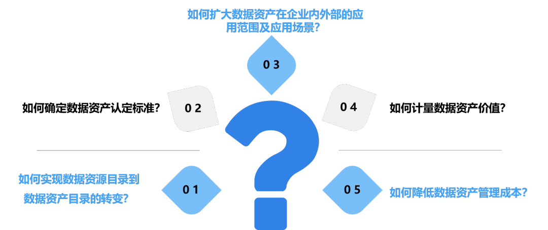 在数据资源化阶段,企业普遍搭建了大数据平台,实现了数据的汇聚,建立了数据资源目录。但是,在迈入数据资产化阶段仍面临五个主要问题。