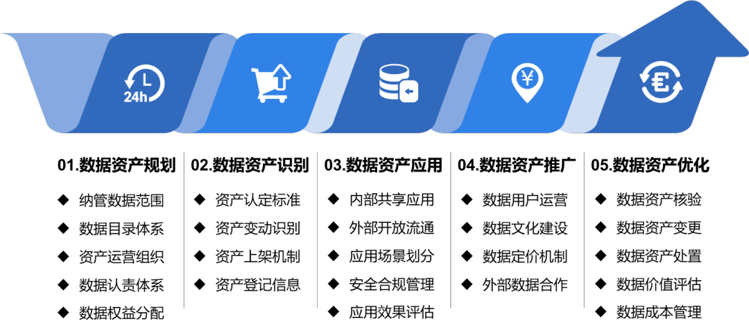 顺利获得调研和评估观察,我们总结出数据资产全运营“五步法”:数据资产规划、数据资产识别、数据资产应用、数据资产推广、数据资产优化