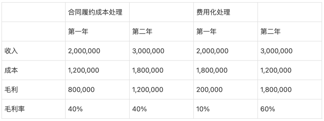 费用化法:第一年毛利率显著低于第二年,可能误导对项目盈利能力的判断。