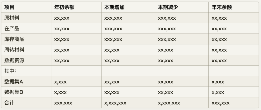 列示方式:存货 xx,xxx 其中:数据资源 xx,xxx