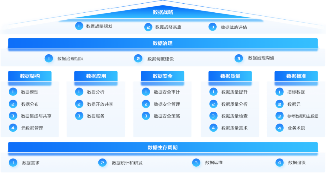 数据资产管理行使权利和控制的活动集合,数治理涉及到数据管理的组织、标准规范、流程、架构等多个方面。数据管理的其他关键过程域都有交互,数据治理是在高层次上制定、执行数据管理的制度。数据治理能力域包括数据治理组织、数据制度建设、数据治理沟通三个能力项。