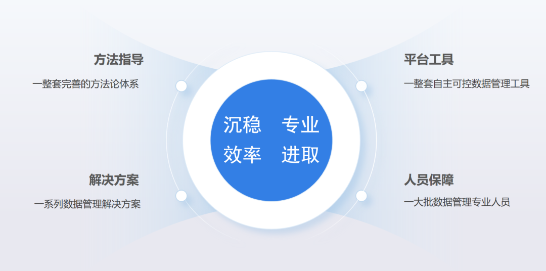 一整套完善的方法论体系:基于DCMM和DAMA数据管理体系,沉淀出成熟、完善且实用的数据管理方法论框架,从指导企业明确自身在数据管理方面的战略目标,到现状分析评估,再基于现状做体系规划,用工具实现规划中的各平台建设,保证实施落地,最后还能为企业培训,实现知识转移。