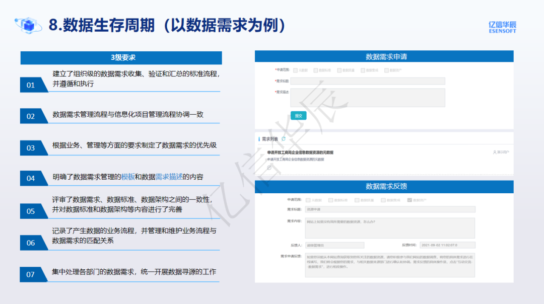 数据生存周期在DCMM作为了一个单独的能力域,是一个动态管理数据的能力域,从数据的需求出发应该能够为用户给予数据需求申请的入口,为了方便或者说保障供需双方的理解一致还应该给予需求模板,需求满足后的跟进反馈,确认供方给予的需求达到了需方的要求,形成闭环。