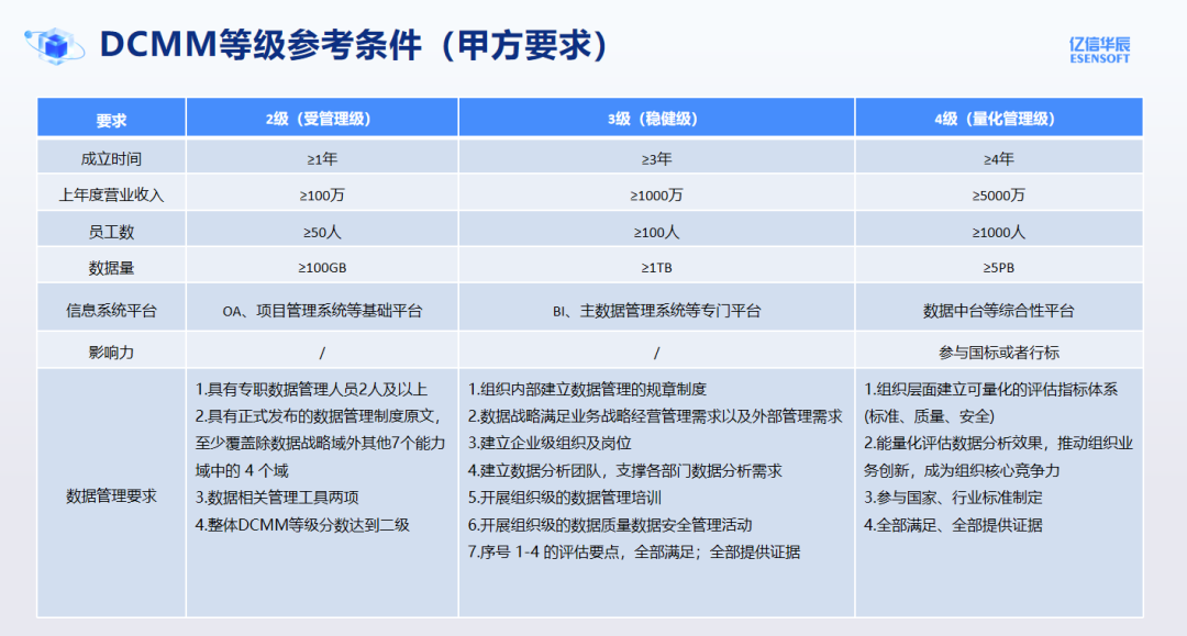 DCMM将数据管理能力成熟度划分为五个等级,自低向高依次为初始级(1级)、受管理级(2级)、稳健级(3级)、量化管理级(4级)和优化级(5级),不同等级代表企业数据管理和应用的成熟度水平不同。根据评估要求,我们发现2级与3级最大的区别是有没有专门的数据管理平台;3级与4级的最大区别是要参与国标或者行标的制定。