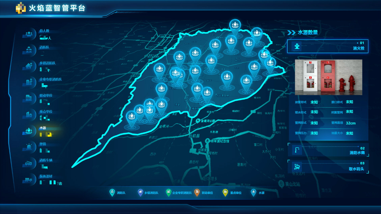 运用文字、罗马数字和统计图相结合的方式,展示消防队、消防救援站当前总人数、企业专职消防队、乡镇消防队、重点单位、联动单位、警情、水源、装备器材、消防车辆、现场指挥现状等KPI,实现数据钻取联动、掌握实时数据和最新视频内容。
