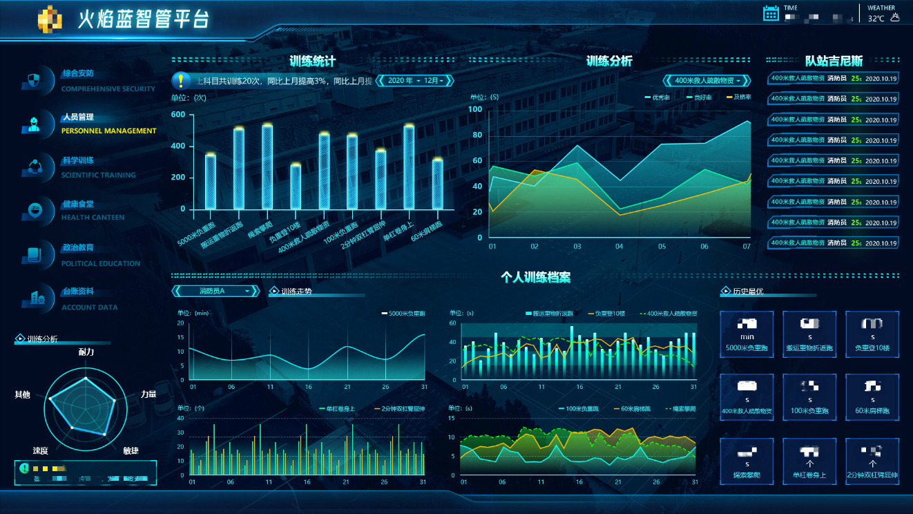 在服务消防救援队站的过程中,根据分析展示需求,结合数据调研情况,设计清晰的故事线。故事线设计紧扣消防救援业务,让展示受众能够清晰体会到消防救援站基本情况以及消防救援队员、队站、食堂、训练等管理情况,让事务活灵活现、使参观者身临其境。