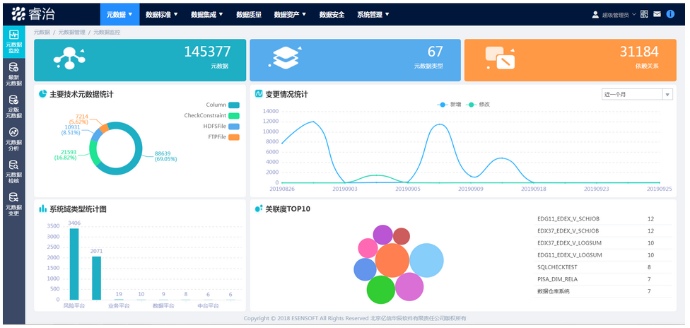 Ebpay元数据管理平台给予了完善的元数据监控功能帮助用户一目了然的分析元数据的使用情况和分布情况,以统计图的方式来展现元数据数量,分布情况,近期变更情况,关联度情况等,可视化效果好并且支持按照用户需求来自定义监控界面。